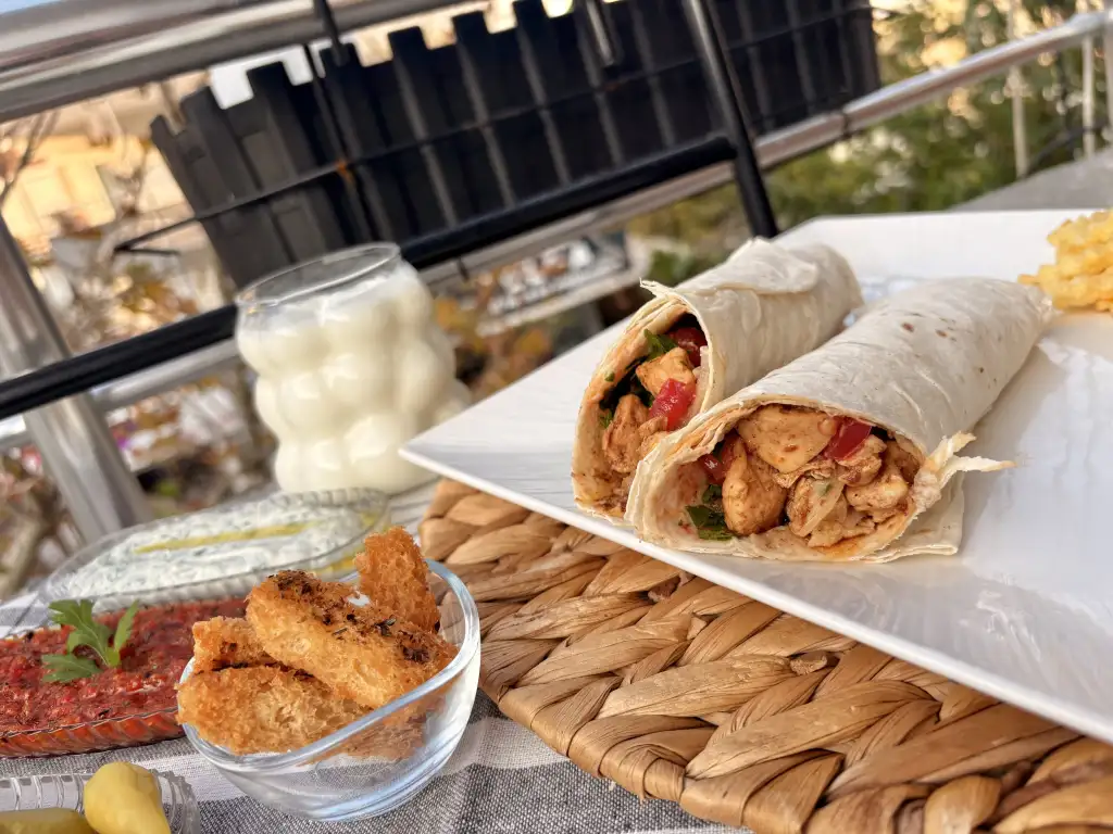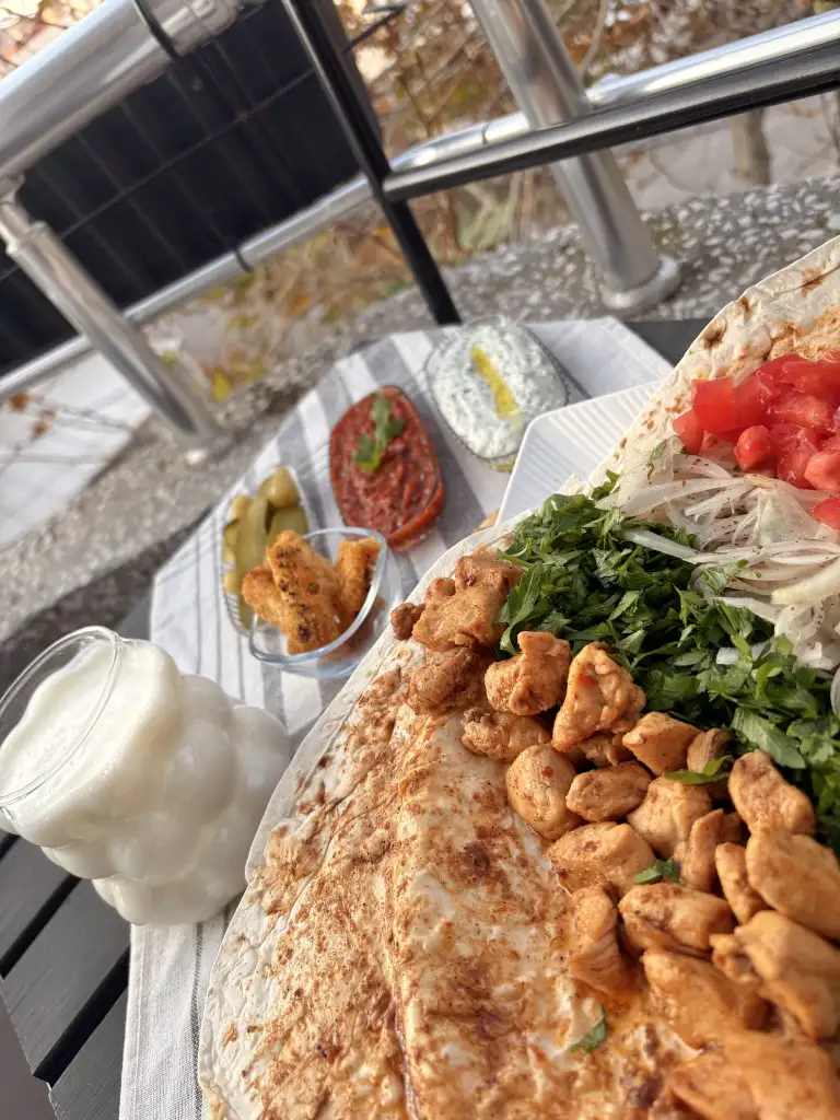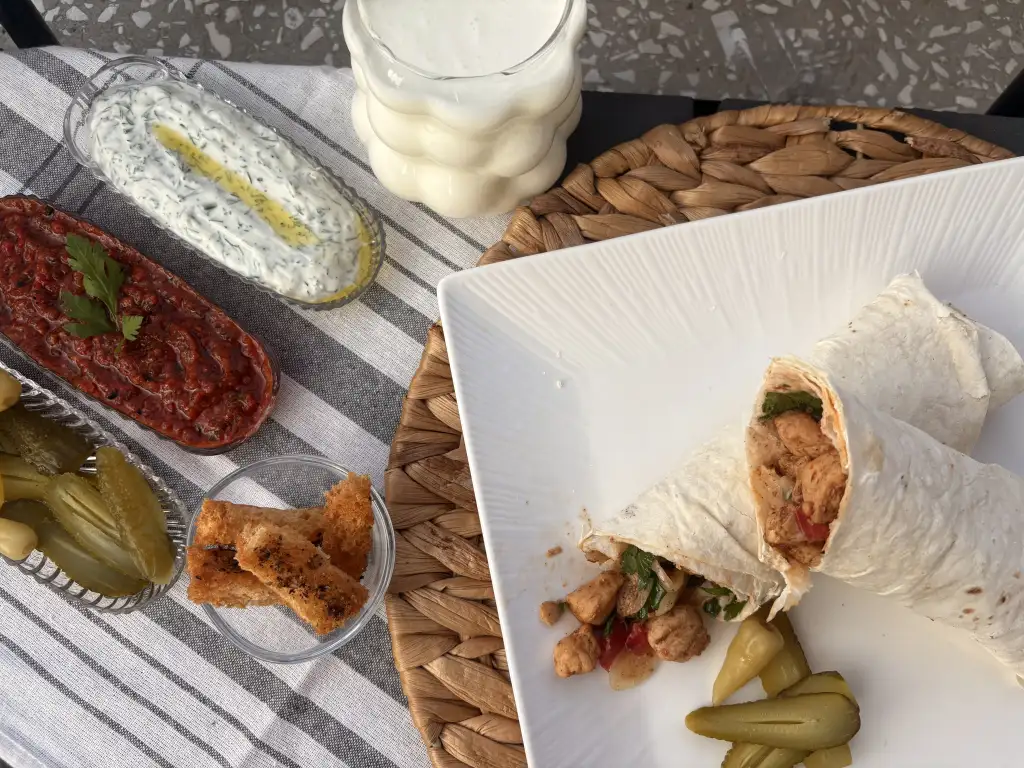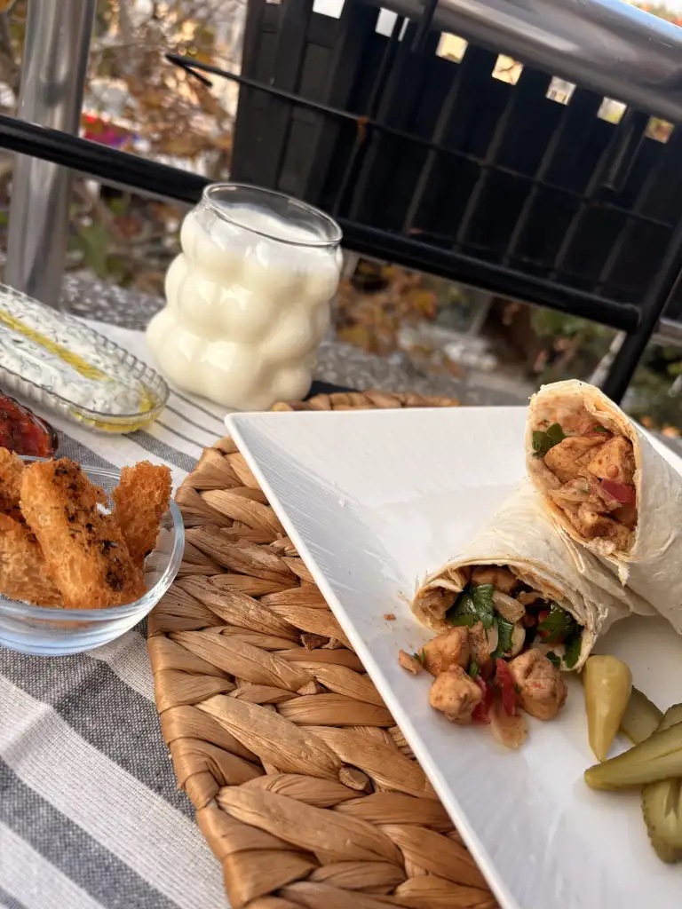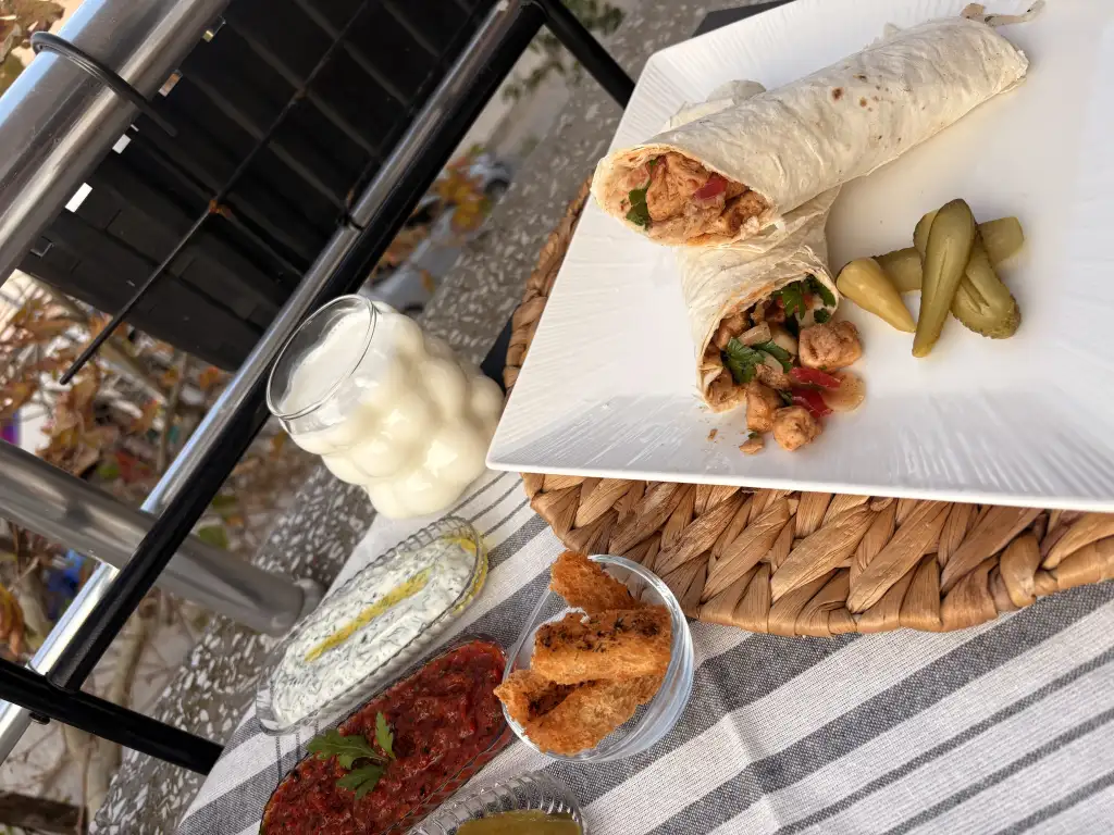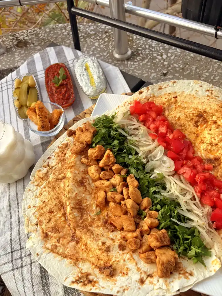 Soğanları ince ince piyazlık doğrayıp tuz ve sumakla ovuyoruz. Maydonozları,domatesleri doğruyoruz ve lavaşımızı tavuğumuzun baharatlı sosuyla buluşturup tüm malzemelerimizi birleştirip sarıyoruz.