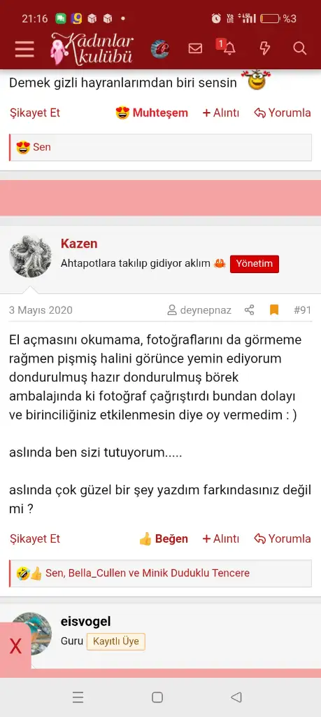Ispanaklı börek yaptığımda konuma yorum yapmıştı. Beğendiği halde birinci olamam diye oy vermemiş bana🤣