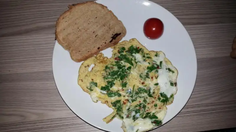 Omletim yağsız. Aslında omletin yanındaki 1 dilim ekmek gibi görünüyor ama aslında az kaşarlı tosttatkım omletin harika yagsızsa eger ve yanında o ekmegin yarısını ye.