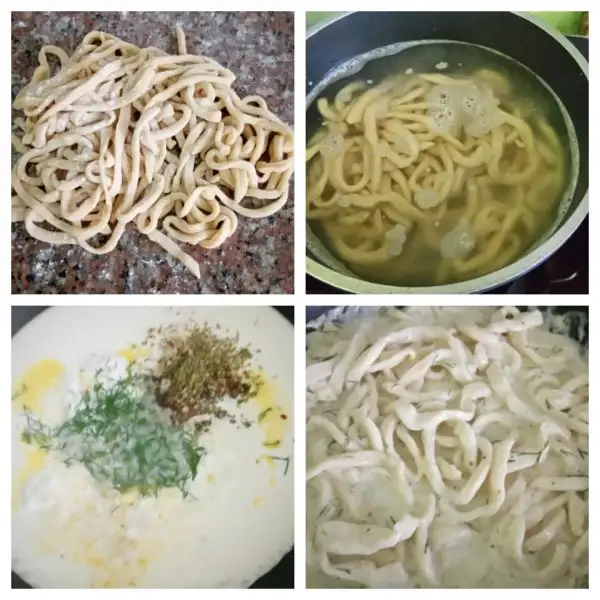 - Tavamıza kremamızı koyalım. Dere otu,terayağı ve baharatları da ekleyelim. 5 dakika kaynadıktan sonra pişen hamurları tavanın içine koyalım, harmanlayalım. Kısık ateşte 10 dakika kremayla özdeşleşmesini sağlayalım.