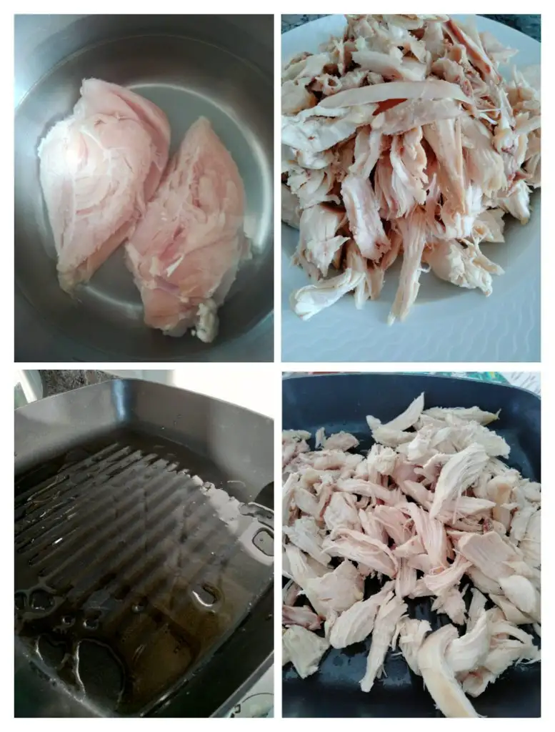Haşlanan tavuk göğüsünü tiftikliyoruz, suyunu dökmüyoruz.