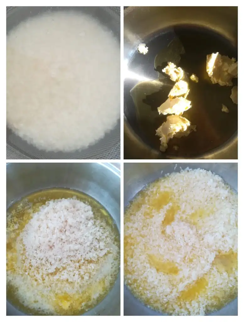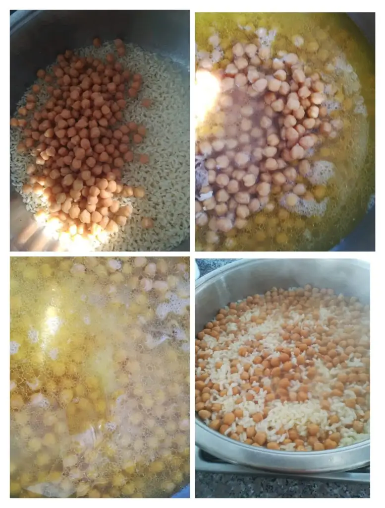 Tenceremize bol su ile yıkanmış olan pirinçlerimizi koyup tereyağ ile sıvıyağ ile kavuruyoruz. Nohutları ekliyoruz. Tuzunu atıyoruz.Tuzunu kontrollü atalım,tavuk suyu ekleyeceğiz. Onunda tuzu var.