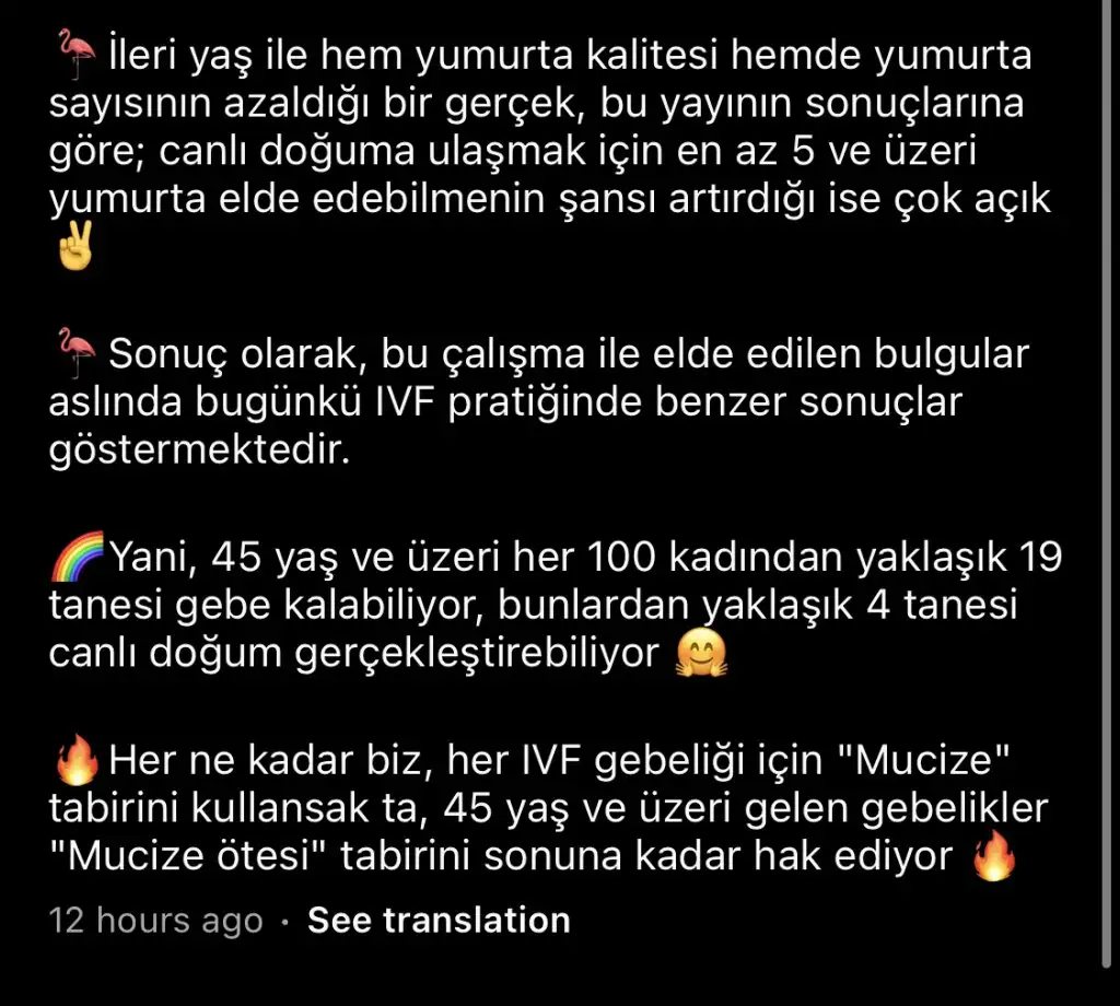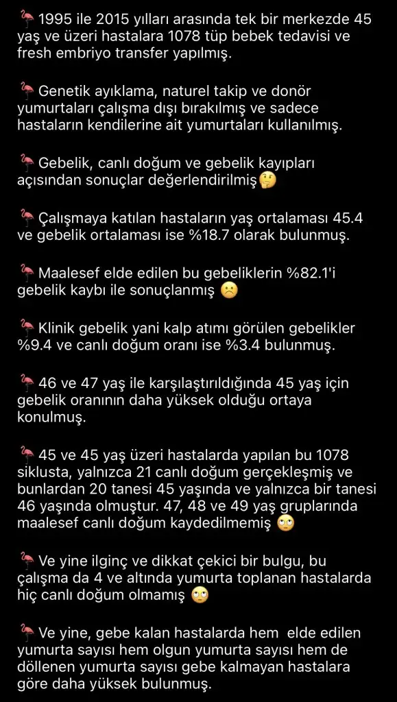 Çok moral bozucu bir çalışmayı yayınlamışlar..İzmir Medicalpark embriyoloğu paylaştı bugün. Ben de size de göndereyim dedim. 45 yaş ve üstü kadınlarda tüp bebek çalışması yayınlanmış. (Genetikli vs dahil edilmemiş)