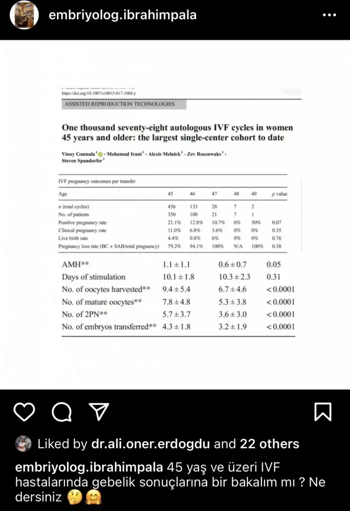Çok teşekkürler canimcimİzmir Medicalpark embriyoloğu paylaştı bugün. Ben de size de göndereyim dedim. 45 yaş ve üstü kadınlarda tüp bebek çalışması yayınlanmış. (Genetikli vs dahil edilmemiş)