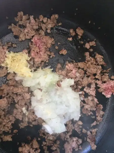 Tencereye kıymayı alıyoruz. pişmeye yakın soğan rendesini ve sarımsak rendesini ekliyoruz.