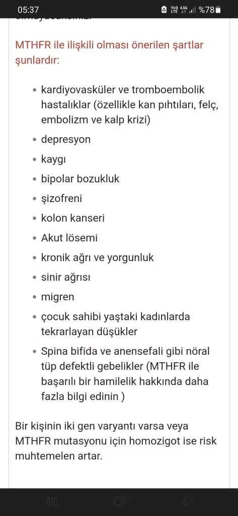 Merhabalar..MTFRH gen mutasyonu aslinda hekeste aynı soruna neden oluyor. Tekrarlayan düsükler..çünkü bu gen mutasyonu sebebi ile vücutta folat tutulmuyor..Gebelik devam ettirebilmenize çok sevindim. Kocaman bir MAŞALLAH..Sağlıkla kucağınıza almanızı dilerim yavrunuzu..Merhaba bu başlığı yeni fark ettim. Benim sonuçlarım da bu şekilde. 2 kimyasal gebeliğim oldu. Şu an 22. haftamdayım sadece oksapar iğne kullanıyorum gebeliğimin başından beri. İlk 12 hafta folik asit de kullandım. Kaç doktora gösterdim hepsi de farklı bir şey söyledi, çoğu da önemsemedi. İğneyi bile ben söylemiştim de öyle yazmıştı doktor. Gebelik testinde pozitifi gördüğüm an kullanmaya başladım. Sonuçlarımı değerlendirecek biri var mı? Eki Görüntüle 3152599