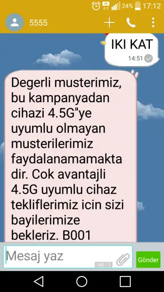 sms attim olmadi :) mesaja cvp gelmedi sanirm bayiye gtmk gerekiyo :)Kiz sen 4.5g ye gecsene olur o zaman