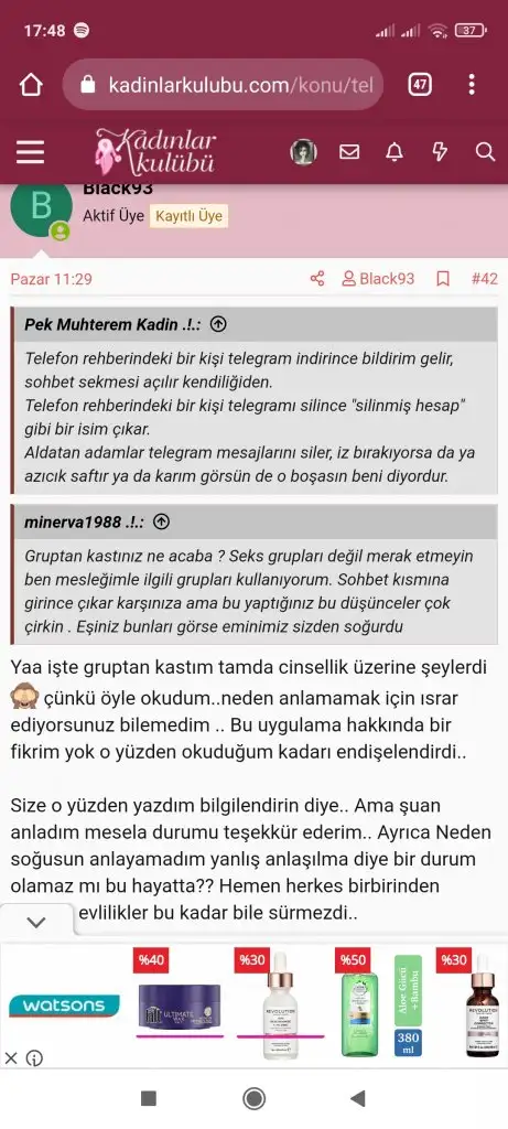 Ben kocamı seks gruplarında falan hayal etmedim ki.. Sırf telegram kullanıyor diye direk bunu düşünsem evet çirkin bir durum fakat gizli görüşmeler vs gibi durumlar olduğunu öğrendim ve üzerine profili gizli gibi görünen iki bildirim gördüm ve sadece durumdan şüphelendim. Eğer dediğiniz gibi eşimi direk o şekilde düşünseydim buralarda konu açıp fikir edinmek ne olduğunu anlamaya çalışmakla hiç uğraşmaz, direk eşime sorardım emin olun..Telegram kullanıyorum diye beni seks gruplarında hayal etse hayatımdaki kişi artık hayatimda olmamalı diye düşünürüm. Empati kurun kocanız karım seks grubunda mi diye düşünse ne hissedersiniz. Aa yanlış anlamadım mı dersiniz
