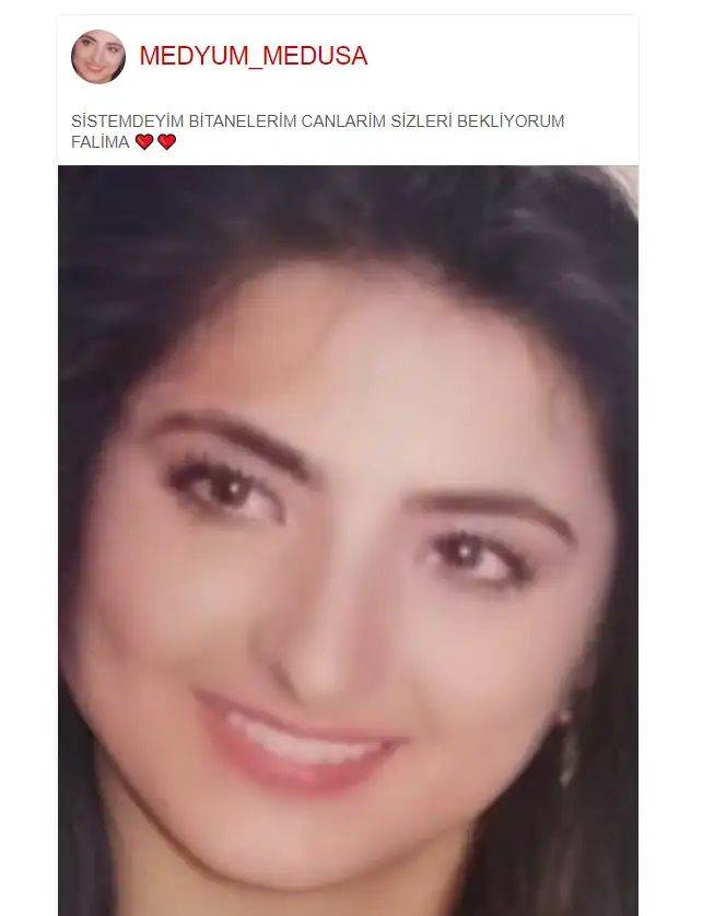 Tobeee belliydi zaten genç biri olduğunu dusunmustuk konusmustuk o zaman.cidden de çoklu biri bu kadın demet bile olabilirBu meydum medusa hani 70 yaşındaydı, öyle söylemişti, herkese evladım, kuzum diyordu. Şimdi de fotoğrafı yenileyip argüman değiştirmiş, genç gibi konuşuyor. Ayrıca yüzü de falcı Fahremez e benziyor ama bilemedim