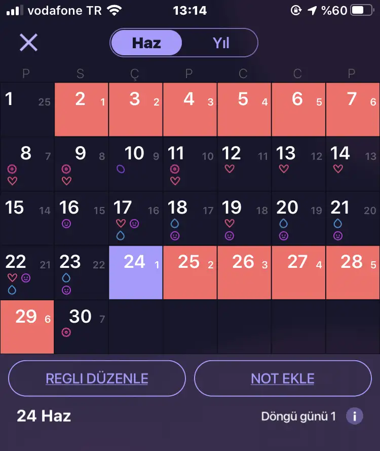 Canım benim bat tarihim 4 temmuz. Sen adet bitiminden 17 gün sonra adet olmuşsun. benim şöyle oluyor; Adet bitimi ve başlangıcı arası 24-25 gün. Toplam döngüm 30 oluyorBende 1 senedir PC yi kullanıyorum ona göre takip ediyorum sizin gibi 24-25 günde bir oluyorum. Ama sadece takvime bakmak çok garanti gelmiyor. Vallahi şöyle söylim dediğiniz gibi yumurtalama takvimine göre o günlerde ağrılarım ve akıntılarım oldu değerlendirebildiğimiz kadar değerlendirdik ama yine de testlerle takip etmek te istiyorum. Hatta Haziran ayının takvimini ekleyeyim büyük ihtimalle sizinki ile aynıdır❤