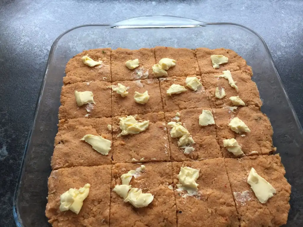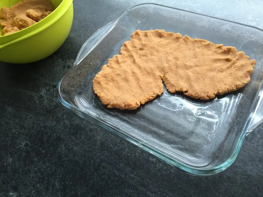 Sonra hamuru ıkıye bolup yagladıgımız tepsıye mandalına buyuklugunde alıp elımızle bıraz acıp yagladıgımız tepsıye yayıyoruz