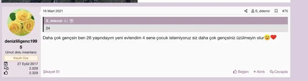 2018 yılında 25 yaşındayım demiş, 2021 yılına kadar sadece 1 yaş almış. Çocuğumuz olmuyor rahim kanseriydim demiş, fakat 4 sene çocuk istemiyoruz söylemi tercihe dayalı bir şey. Bu zamana kadar konulara tüm yorumları “kaç yaşındasın, neden erken evlendin, çok erken, kaç yaşındasın…kaç yaşındasın…” diye gidiyor istisnasız. Tüm yazdığı cümleler yalan değilse bende hiçbir şey bilmiyorum, net. Lütfen bir uzmandan destek al. Hiç normal bir psikoloji değil bu.