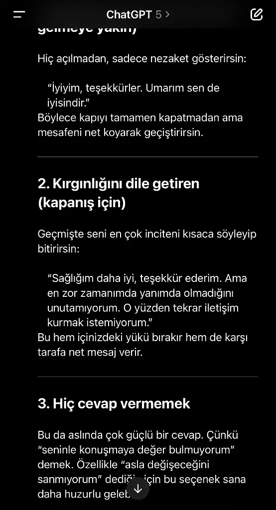 Hiçbişey yazmadım yazmayı da düşünmüyorum haklısınız doğru olan bu bence de. Her türlü cevap iletişimi başlatmak demek. Ve ben ayrıldıktan sonra çok huzurluyum hastalığım bile toparladı.Yazmayın direkt engelleyin. Ne yaptınız son durum nedir?