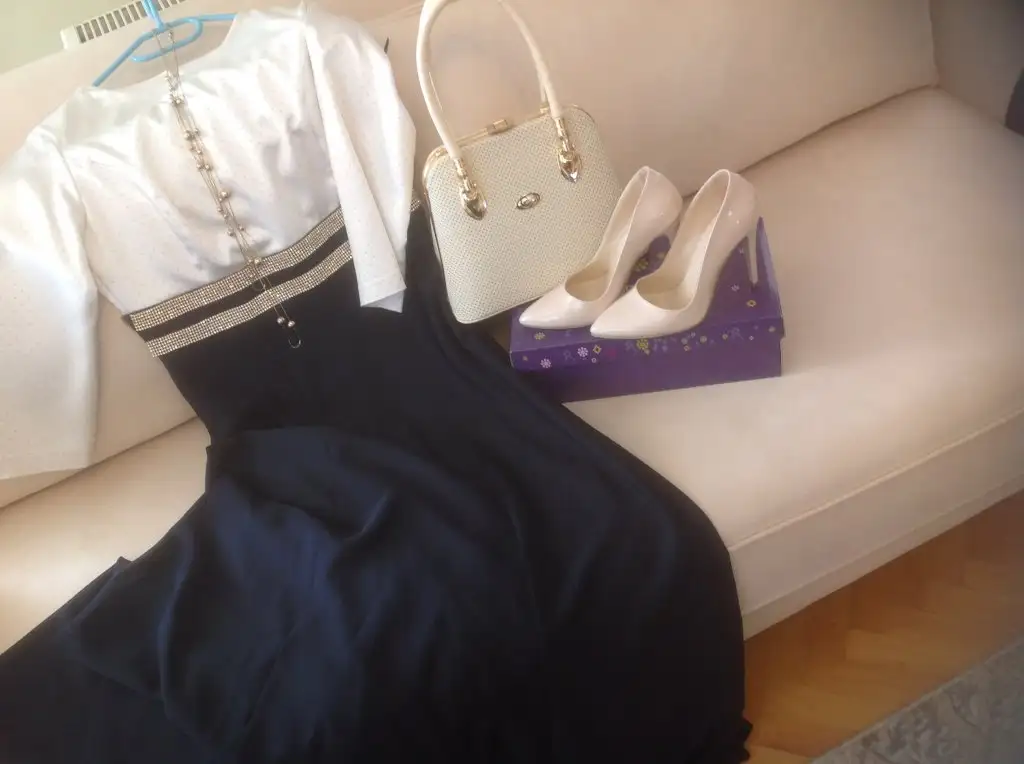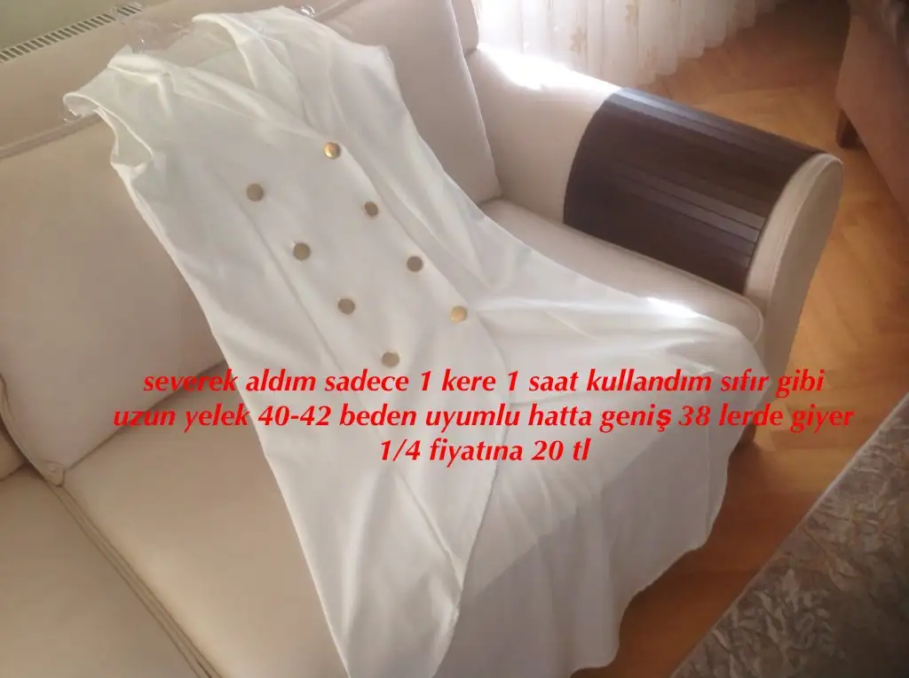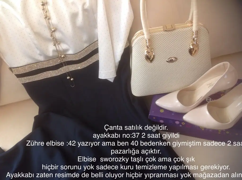 Zühre Mağazasından aldığım sadece 2 saat kullandığım çok şık bir elbise...herkes beğenmişti...beğenirseniz tam ölçülerini veririm hiçbir sorunu yok, ayakkabıda satlıktır o da sadece 2 saat giyildi...elbiseye kuru temizleme yaptırmanız iyi olur üst taraf beyaz olduğu için hafif kirlenmiş...pazarlık yapılır yeter ki ihtiyaçı karşılasın...