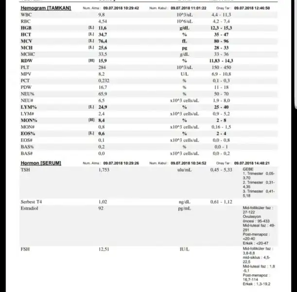 Kansızlık var ama çok ciddi değil biraz düşük. Gebelik düşünüyorsan sıkıntı olur ama. Bi de lh çok yüksek. Kan verirken adet zamanı mıydı sonra mı.