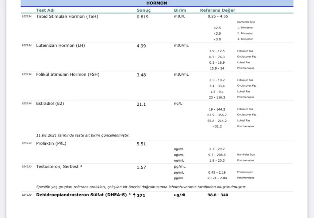İlk kez ben de bir konuya dahil oluyorum 🤭 SAT 22 mayıs. Pcosluyum fakat sadece ultrason görünümünde hafif var. Kilom 50 boyum 1.65cm kilo sorunum yok, beslenmeme de dikkat ediyorum fakat bundan 1-2 ay önce adetin 3ncü günü hormon tahlili için kontrole gittiğimde sonuçlarım bu şekilde çıktı hemen ekliyorum. Dheaso4 hormonum yüksek ve doktor da yumurtlamayı engeller diğer adette dkh başlayalım dedi. Ben de adetim gelene kadae omega 3 folik asit kullanmaya başladım. Ovü testi de arada yaptım.( düzenli değil) Sanırım adetin 18ncü günü yani dün pik gördüm. Dün ilişki oldu. Bugün mü yumurta çatlamıştır acaba? birde dün yoğun uzayan akıntı gelince şüphelenip ovü testi yapmıştım ve böyle pik gözüktü. Adetlerim bu arada 28-30 gün arası. Bir şey daha sormak istiyorum. Bugün spor yapabilir miyim? Sorun olur mu? 🥲