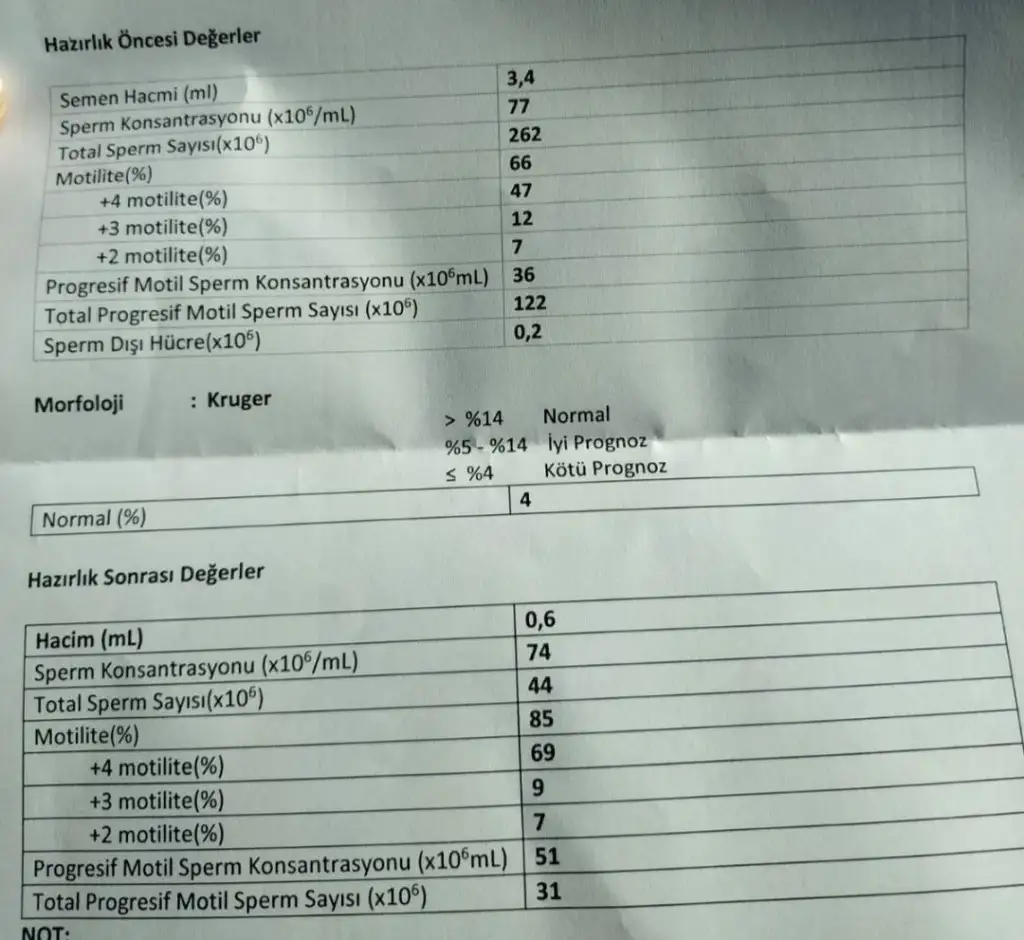 İnternetten o kadar araştırdım ki ama hazırlık öncesi sonrası diye bisey göremedim bende.. Daha klomen aşamasındayız canım. Doktor bu testleri istedi. Amh düşüklüğü var bende.. Bir de sperm testine bakmak istedi sanırım. Ona göre tedavi önerecek tahminimce.. Hazırlık sonrası değerleri daha düşük onu dikkate alırsak sence hazırlık sonrası değerleri nasıl?canm sperm sayısı ileri hız ve morfoloji önemli diye biliyorum ama sizin sonuçta hazırlık öncesi ve hazırlık sonra yazdığından anlamadım aşılama falan yaptırdınız mı