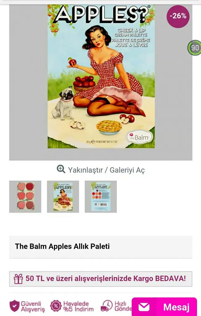Kızlar Thé Balm palet, pudra ve ve tester parfüm almıştım dün akşam üstü geldi indirim kodu vardı site yeni açılmış galiba bende kredi kartı çok kullanmıyorum ne olur ne olmaz diye ayrica havaleye %5 indirim vardı.. Ayrıca görünen 3 kalem hediye gönderdiler bu şekilde çekip ınstigram da paylasirsam yine hediye çeki alacağımi belirttiler.. 146,20 tuttu.. Ayrıca aradım Thé Balm ruj paleti gibide kullaniliyormus.. ruj kullanmak istemeyen sürebilir dedi.. güzel işimi görür bir taşla iki kuş![]()