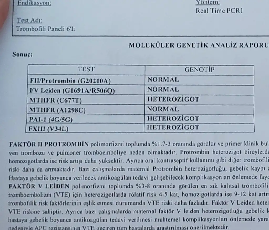 Bende sadece biri heterozigot çıktı diğerleri normal genetik uzmanı, pıhtılaşma yatkınlığın var normal süreçte olmasa dahi gebelik sürecinde bu yatkınlığın çeşitli etkenlerle artabileceğini söyledi. Benimde düşüklerim var ( en son 12 haftalık kalbi durdu bebeğimin) pıhtılaşma sebep olmuş olabilirde olmayabilirde denildi. Hamile kalınca kadın doğuma gittim ilaç başlatmadı sonra tekrar genetik uzmanına gittim mutlaka başka bir doktora git dedi ve özele gitmeye başladım gider gitmez iğne başlattılar tedbir amaçlı doktor riske atamayız dedi, şuan kullanıyorum umarım bu defa olur