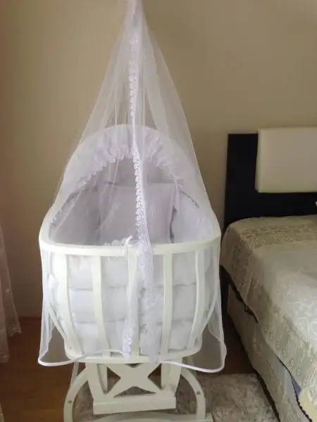 Beşiğimiz Atlas Tahtaravalli Sepet Beşik, iç yorganı vs Yorgancıoğlu marka. Yatak odasında yatağımın yanında kullandım. Tek parmağımla bile sallayabiliyordum uyku arası, çok rahat. Fiyatı: 350 TL