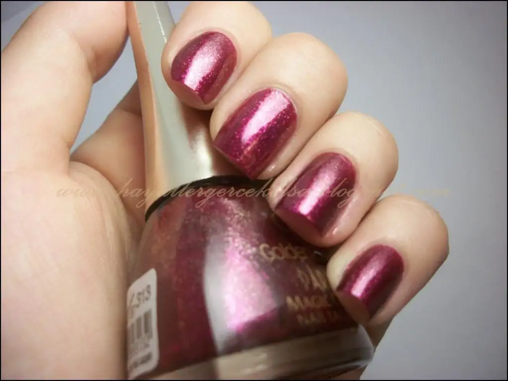 Bugün ün pembesi Golden Rose Magic 313.Magiclerin çok şeffaf olduğunu duyunca almam diye düşünmüştüm Flormar Miracleler daha cazip gelmişti renkleri dolayısıyla .Bu oje çok parçacıklı ve parlak duruyordu başka ojelerin üzerine sürerim diye aldım ama oje kendi başına da opak .İki katta yeterli oluyor ve hızlı kuruyor.Flormar Miracle de de bu renk var hatta Zoya Alegra ya da benziyor .Yakında bir karşılaştırma yazısı yaparım....