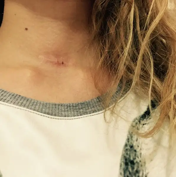 Benimde en büyük endişem gelinliğimde görünmesi. Hastaneye gittiğimde bi kız gördüm onunkisi çok büyüktü kesik izi onu görünce iyice endişe yaptım.Bak canım sana özel olarak çektim minicik kaldı bu kadar bile kalmazdı aslında ama ben barışığım izimle o yüzden kullanmadım estetisyenin verdiği kremi...gelinliğimde de tam o bölgeye gelecek bir inci kolye taktım hiç ama hiç görünmedi... L loveyou3434