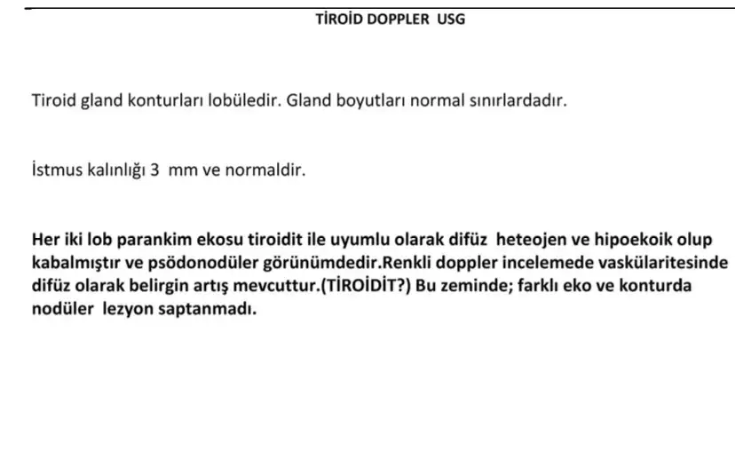 Ben geçen sene boyun usg çekilmiştim orada tiroit heterojen çıkmıştı ama bi sorunum olmadığı için kan da normal olduğu için hiç gidip sormadım gözlerimde değişikliği farkedince tiroit için dahiliyeye başvurdumKan değerleriniz normalmiş, doktor neden usg istedi? (Merak ettiğim için soruyorum, alanım değil.)