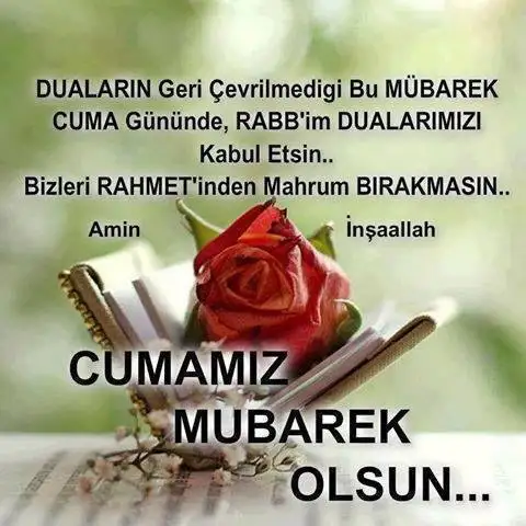 HAYIRLI CUMALAR ALLAH'ım Ruhumu Daraltma Kalbimi Karartma Darda koyup Aratma Hak yolundan saptırma Bizi SENDEN Başkasına Yalvartma..Takdir senindir Ya Rabbi! Sen ki imkânsızı mümkün kılansın darda koyma bizi! Dara düştüğümüzde de şükredenlerden eyle... ALLAHIM DUALARIMIZI KABUL AMELLERİMİZİ KATINDA MAKBUL EYLE.ALLAHIM KAZA,KEDER,BELA,SIKINTILARDAN SANA SIĞINIRIZ YARABBİ.PEYGAMBER EFEN...DİMİZ MUHAMMED MUSTAFA (s.a.v)'İN ŞEFAATİNİ NASİP EYLE,AFFEYLE YARABBİM.. Ey Rabbim senden bir tesehhud miktari ömür, bir LA İLAHE İLLALLAH mikarı ölüm istiyorum senden... LA İLAHE İLLALLAH..Amin..Ey Rabbim! Senden bildiğim ve bilmediğim hayrın hem çabuk, hem geç olanını istiyorum. Ey Rabbim Resûlünün senden istediğini istiyorum, Resûlünün sana sığındığı şeyden ben de sana sığınıyorum. Allah'ım benim için kaza ettiğin şeyin âkibetini doğru yola ulaştır..Amin.