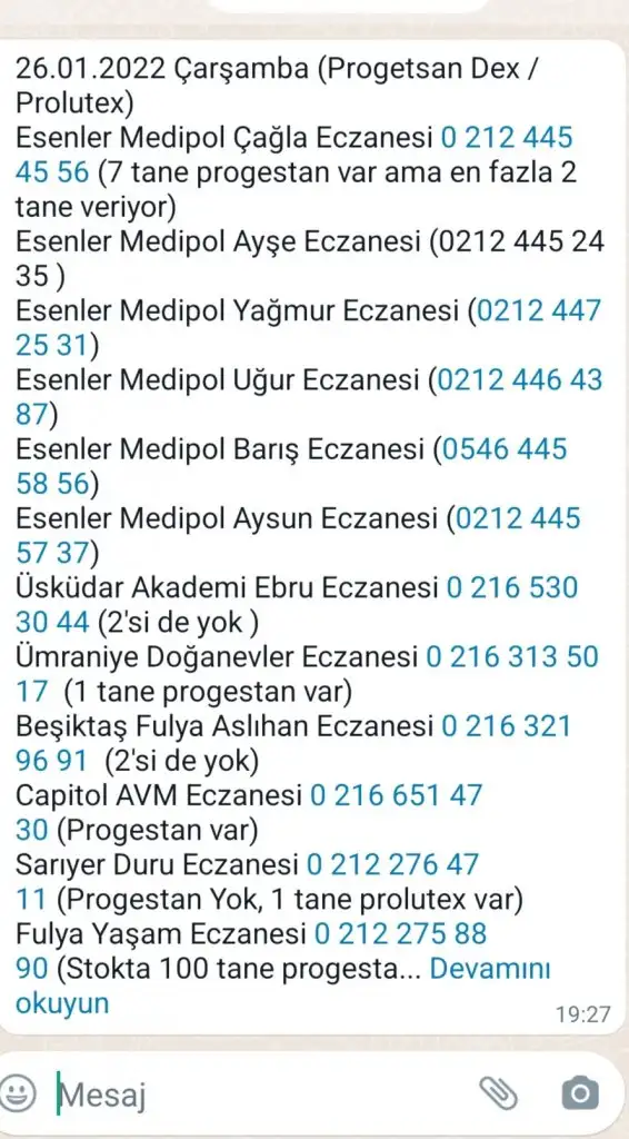 Dün Amerikan Hastanesin civarı bütün eczanelere sorduk hiçbirinde yoktu. Bahçelievler de Memorial yakınlarındaki eczaneleri aradım. Orada da yoktu. Şimdi sizin dediğiniz yerleri arayayım. Bir umut işteAmerikan hastanesi civarındaki eczanelerin bazılarında bulunuyor. Bir kere de Bahçelievler Medikana orda buldum. Fulya’da bulamadım.