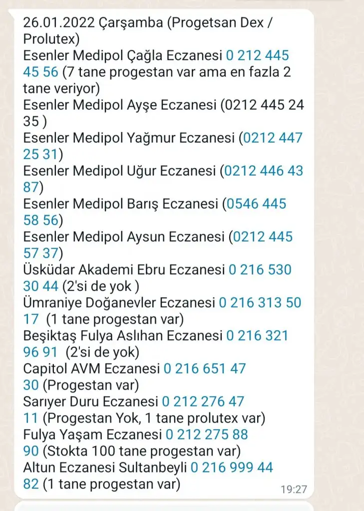 baktım sinem eczanesiymiş canım benim aldığım yer bahçelievlerde her zaman ilaçlarımı bulabildim orada aklında bulunsun allah işini rast getirsin temin edersin inşallah kolaycaŞimdi bir kaç yere daha sordum. Haber bekliyorum. Dediğiniz yerlere de sorayım teşekkür ederim.