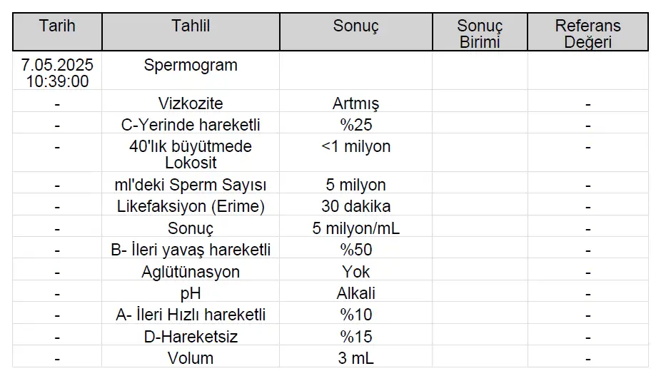 Canım üzülme ümidini yetirme benzeri benim başıma geldi bizde 7 yıllık evliyiz eşimin çocukluktan gelen doğuştan yani hem peygamber sünnetliymiş ve 7 yaşındayken eşim inmemiş testis amaliyatı olmuş eşiminde sperm hareketsizliği vardı 2022 senesinde İstanbul’da Mikrotese oldu Medicalde doktor önce o kadar ümitli konultuki amaliyattan sonra hiç yok dendi dünyamız yıkıldı zor dedi sonra 1 sene kadar ara verdik çok çöküşteydik pes etmedik eşim başka bir doktorla görüştü amaliyat olmadan macun iğne ilaç aklına gelecebilecek herşey kullandı hem hareketlendi hem çıkışları oldu eşimde bebek spermler vardı amaliyat eden doktor söylemişti zaten onuda Allah islah etsin bizi bir mal olarak para nasıl koparabiliriz diye diye soydular 2 senemiz çöp oldu boşuna M.tese oldu eşim şimdiki doktorumuz sayesinde şimdi Tüp bebek sürecindeyiz 2 ay önce yaptık tuttu 7 haftalıkken düşük yaşadım ama bu seviyeye de gelemeyeblirdim hiç birşey çıkmasaydı eşimde 14 yumurtam toplanmıştı 7 si bizimle kaldı tekrar 1,5 aya gideceğim transfer için ümidini yetirme doktorumuzda ne vakalar vardı hepsi şimdi çocuk sahibi olmuşlar instangramdan bizde şahit olduk sayfasında istersen ismini verebilirim 6 sene çok çabaladık eşim İzmir Ankara İstanbul bütün doktorlara gitti ama doğru tercih yapıp bugünlere gelebildik şükür ki ümidini yetirme dediğim bu ki seni çok iyi anlarım