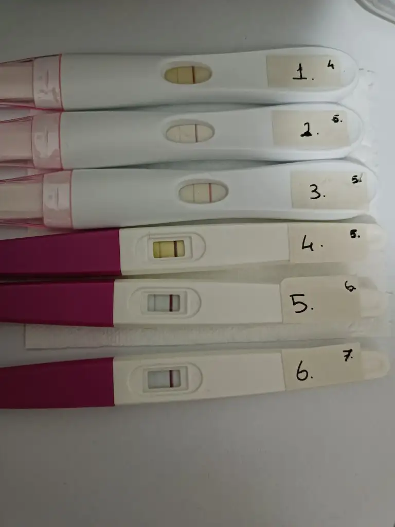 Kızlar 19 Haziran'da 1 dondurulmuş embriyo transferi oldum pcos olduğum için 1 ay sonrasında transfer yapıldı çatlatma iğnesi vs kullanmadım. Transfer gününü saymazsak 4. Gün idrar testi yapmaya başladım bugün 7. Gün ama sanki biraz çizgi siliklesti endişeleniyorum bir bakar mısınız testlerime 🥹🧿❤️