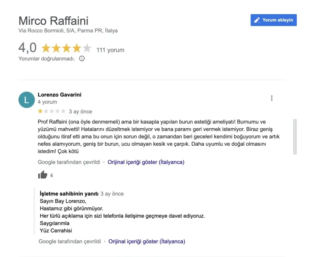 Evet. Aldım. Ama o da bilmiyor nasıl yorumun silindiğini.ben silmedim dedi. O halde google reviewse şikayet sonucu silindi. Dediğim gibi kimse 1 paragraf italyanca yorum yazmaz, mutsuz olmasa. Nereden bilsin bu doktoru ayrıca. Ben iş ahlakı için böyle şeylere fazla dikkat ediyorum. Katrib var mesela çok yetenekli yurtdışında o da biraz böyle şeyler yapmış o nedenle o bile beni düşündürdü.Ben inkar edecek bir doktor olduğunu düşünmüyorum illaki her doktorun istediği gibi iyileşmeyen hastası olur sonuç olarak iş sadece ameliyat ile bitmiyor iş geri cevap alabildiniz mi