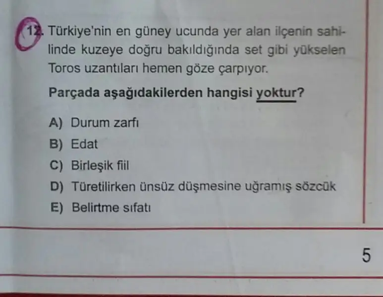 12.sorunun cevabı E şıkkı. Birleşik fiil var zaten göze çarpmak deyim olduğu için onu eledim.ben Türkiyenin güney ucu tamlamasında takıldım hangi ucu dediğimizde güney ucunu işaret etmez mi yani o da belirtme sıfatı olmaz mı sizce