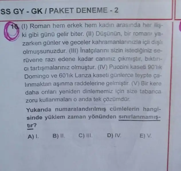 16 numaralı soru E olacak bu tür sorularda zaman kipi arayacağız E şıkkinda zaman kipi yok dolayısıyla zaman bildiren bir durum da yok.