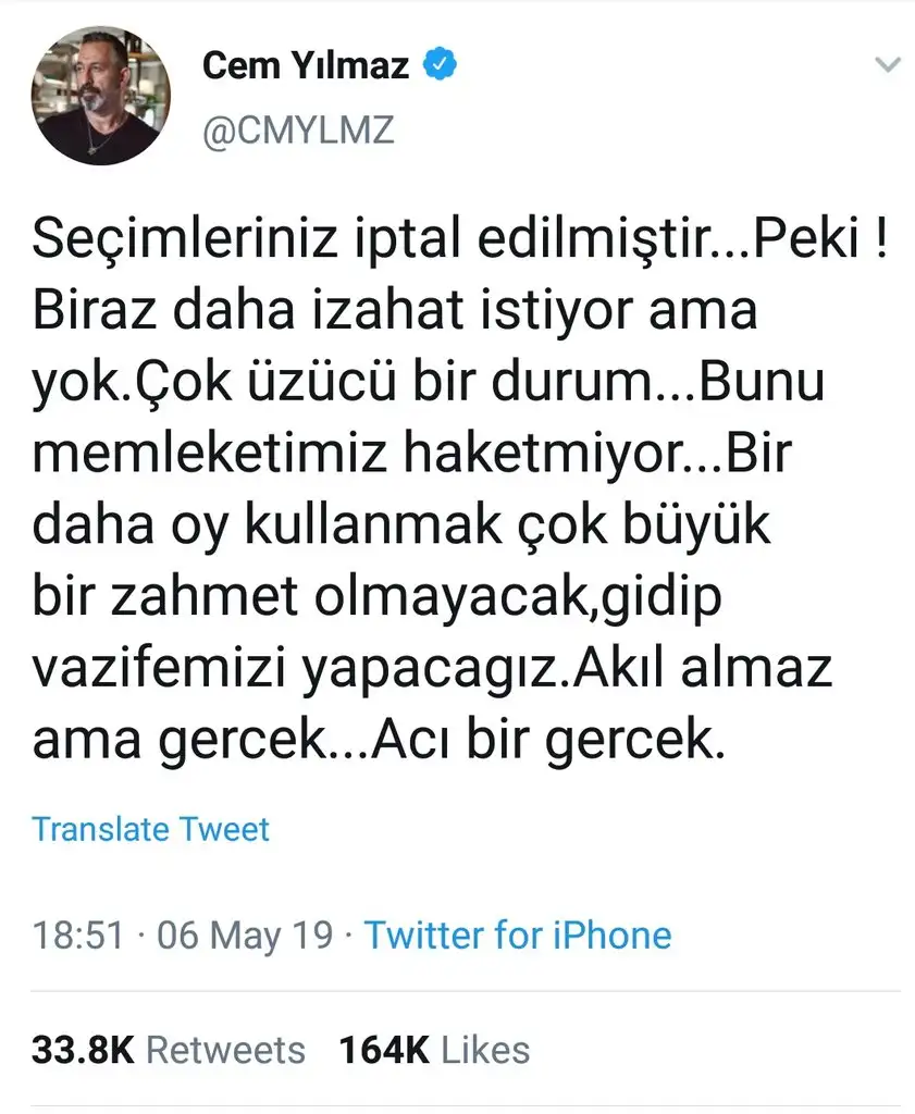 cem yılmaz bile tekrar oy atmaya gitmek zahmet olacak demiş