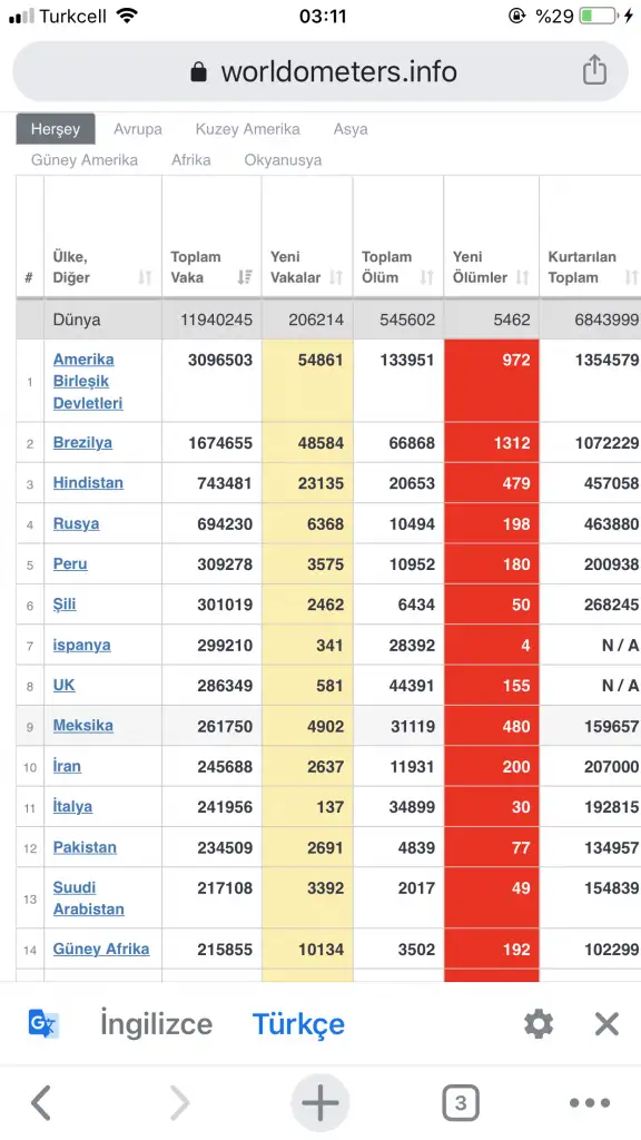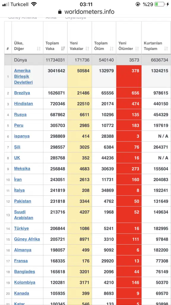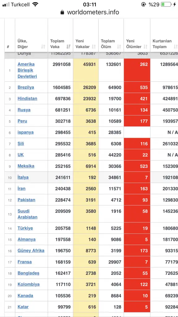 Bizim doktor Amerika’yı örnek veriyor test sayıları çok olduğu için vaka sayıları azalmıyor ama ölüm oranları çok düştü diyorBen de anlamadım ya. Bir tek bizim ülkede sabitlendi galiba ölü sayısı