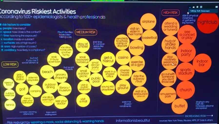 500'den fazla sayıda epidemiyolojist ve sağlık çalışanına göre COVID-19 bulaşma riskinin en düşükten en yükseğe olduğu aktiviteler var burada. Birazdan çevirisini de yapacağım.