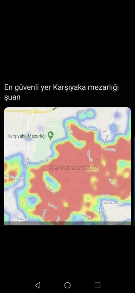Ankara için de öyle bi paylasım varİzmir'de güvenli olan tek yer Karşıyaka mezarlığı... Onun dışında her yer kırmızı... (HES uygulamasından biri paylaşmış ama fotoyu bulamadım).