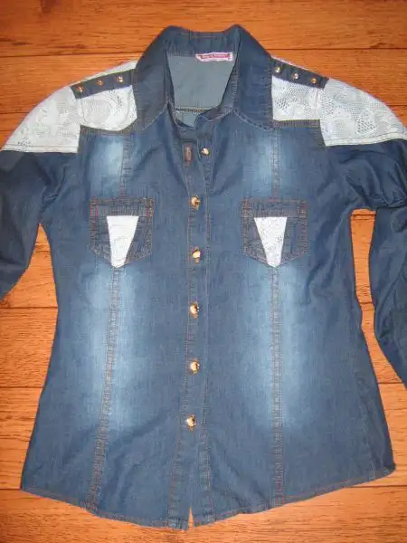 4- hafif likralı kot gömlek hiç kullanmadım 36-38 beden. kolları apoletli yaka cep ve ense detayı beyaz dantelli taşlanmış model15 tl