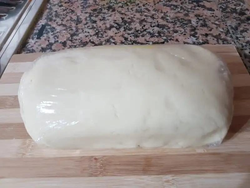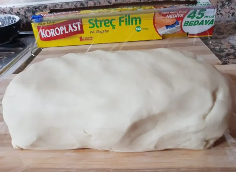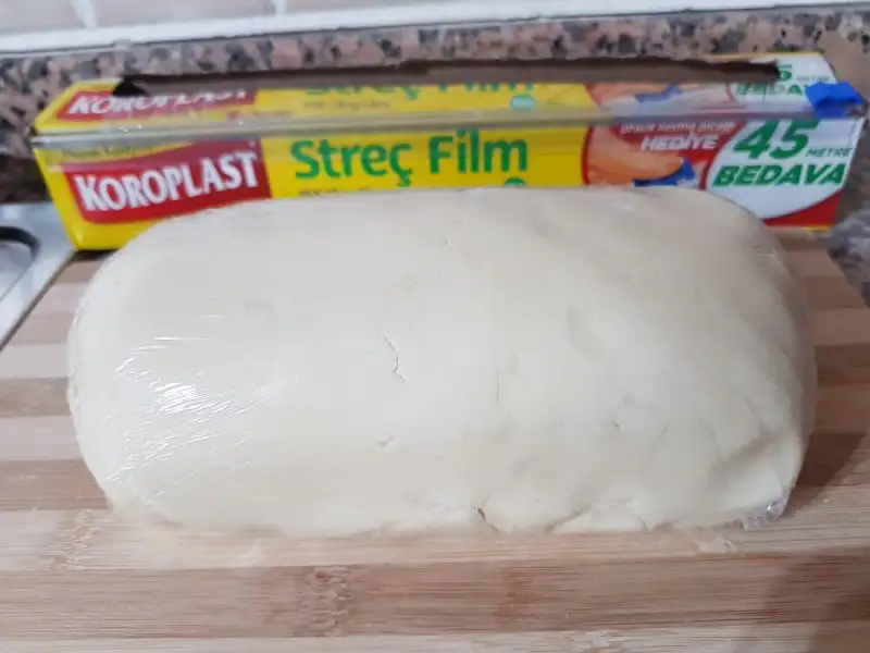 Sonra hamuru strech filme sararak yaklaşık yarım saat buzdolabında bekletin.