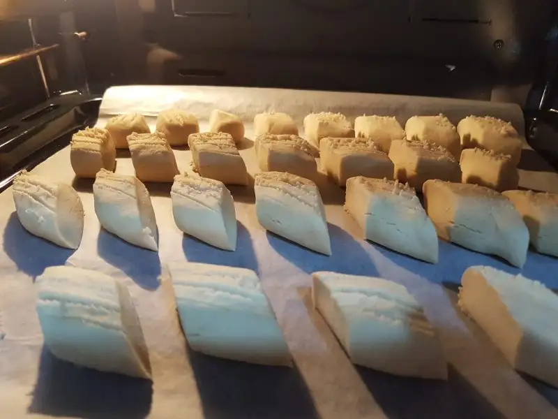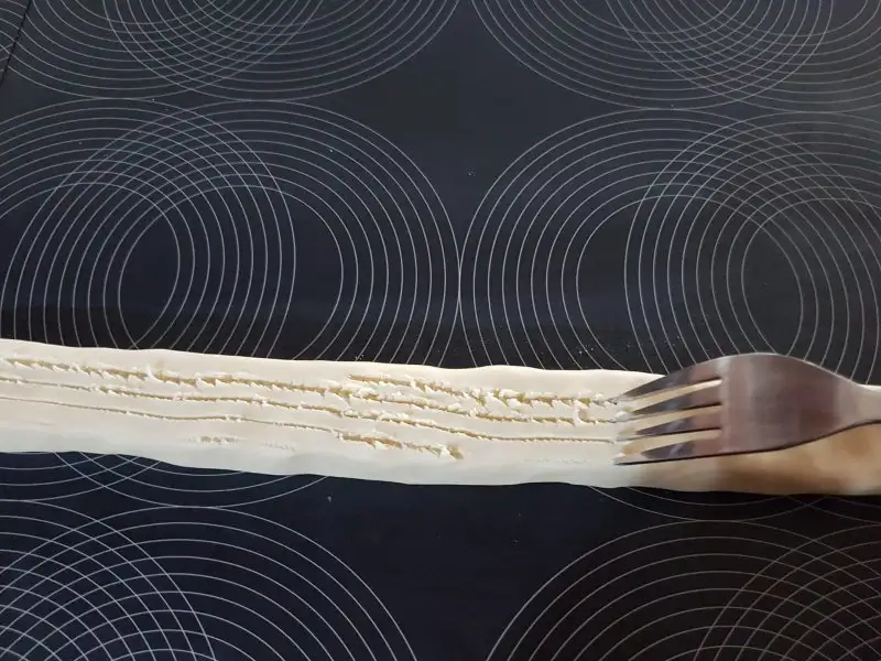 Hamurun ilk yarısını iki parçaya ayırıp ve 2-2,5 cm eninde rulolar hazırlayın ve çatalla üzerine çizikler atın.Daha sonra bir bıçak veya keski yardımıyla verev olacak şekilde yaklaşık 3 cm lik parçalara bölün.