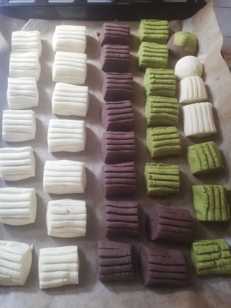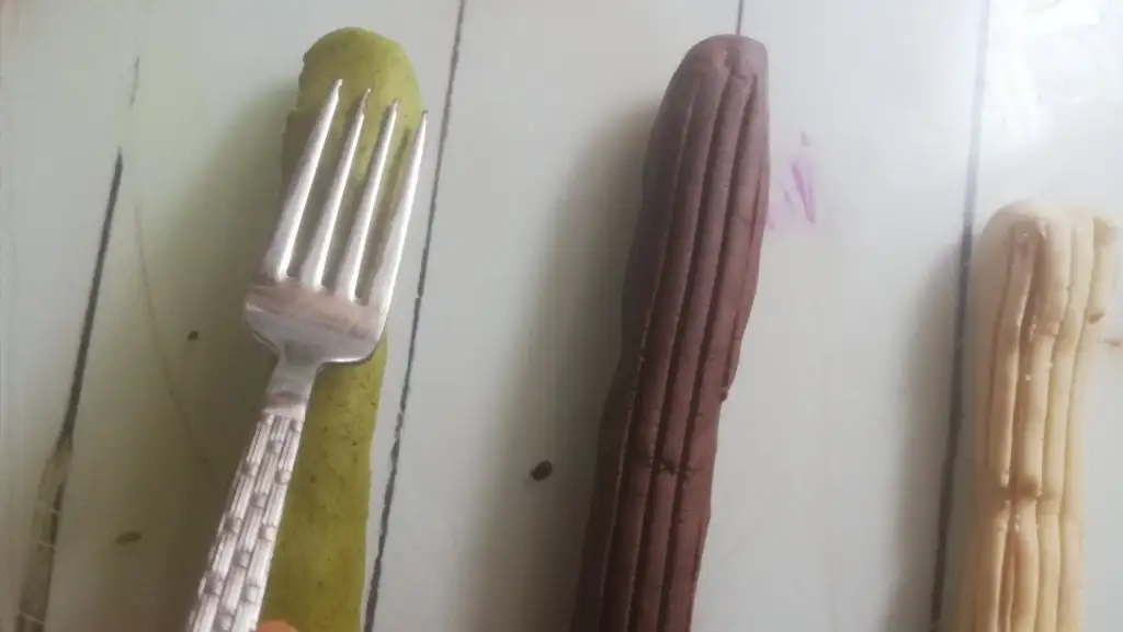 -Dinlenen kurabiye hamurunu 2 veya 3 parçaya bölelim.Fırınımızı 150 dereceye ayarlayın yapıma başlayalım Uzun rulolar yapıp üstten ve yandan çatalla bastırarak çizip şekil verelim İster düz ister verev şeklinde keselim. Veya küçük küçük yuvarlak yassı şeklinde de yapabilirsiniz.