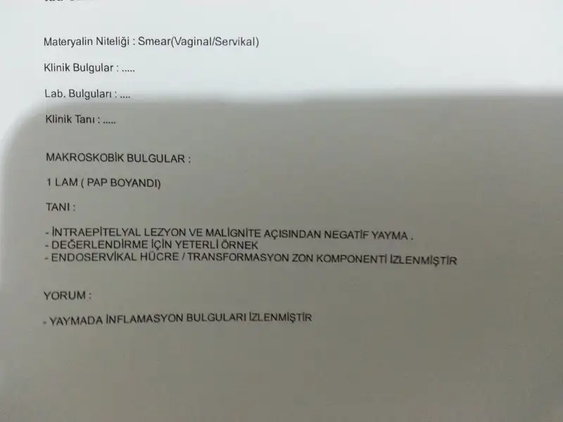 Endoservikal transformasyon zonu komponenti görülmedi veya transformasuyon zonuna ait hücreler izlenmedi gibi sonuçlar da testte yeterince hücre görülmediği anlamına gelir, yeniden smear alınmasını gerektirir, test şu haliyle olumlu veya olumsuz bir sonuç anlamına gelmez.
