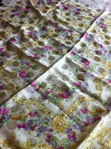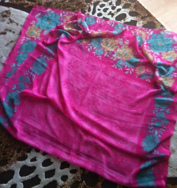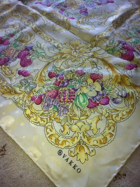 %100 orjinal vakkodur. büyük boy ipek eşarp. sarı bej zemin üzerinde pembe mor çilek, üzüm ve böğürtlen deseni var. dokusunda puantiye deseni var. nadide bir eşarp. 30 tl dir kargo alıcıya aittir.