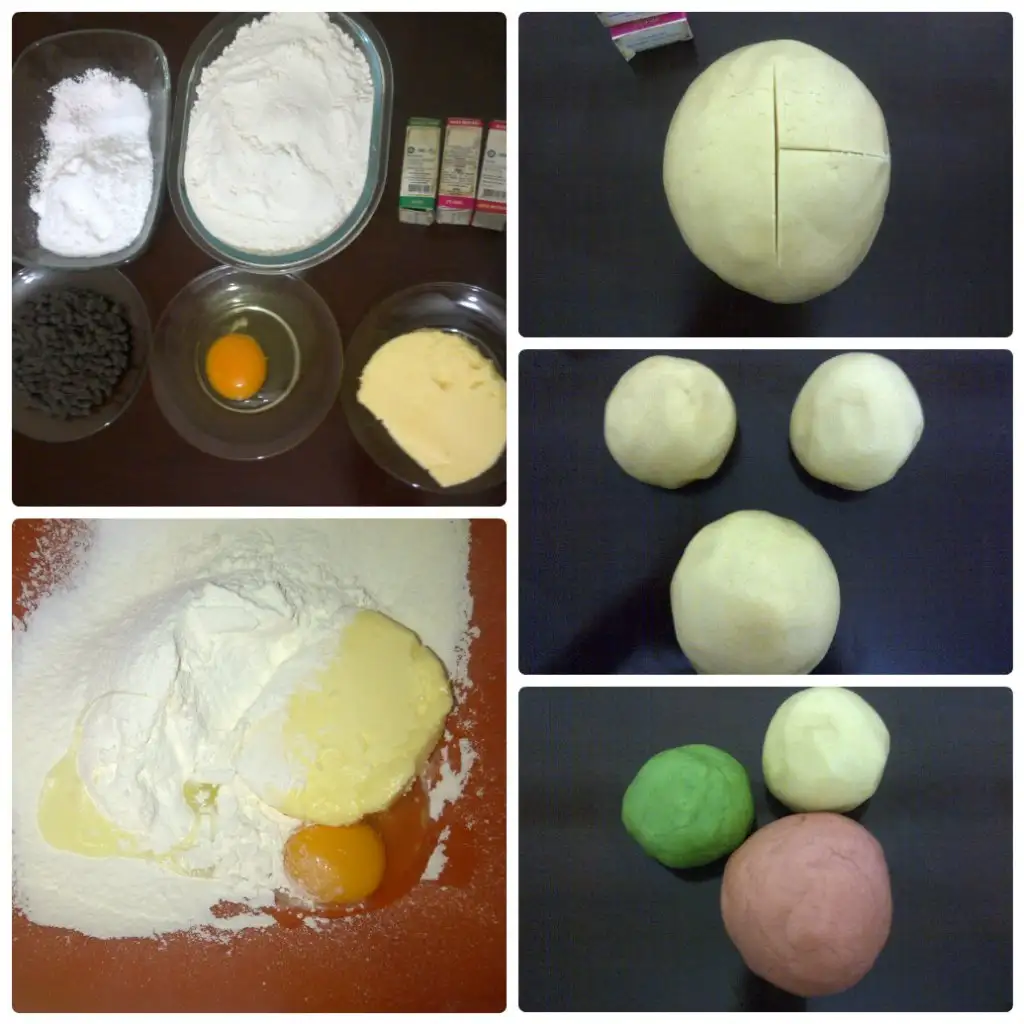 Çıkan hamurun yarısı kesilir bir diğer yarısı tekrar yarıdan kesilir. Büyük parçaya kırmızı gıda boyası Küçük parçanın birine yeşil gıda boyası eklenir. Kalan küçük prçaya bir renk eklenmez istenirse beyaz eklenebilir.