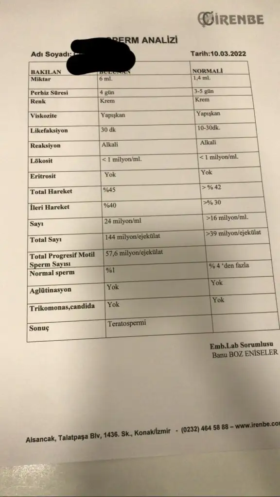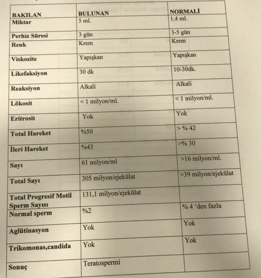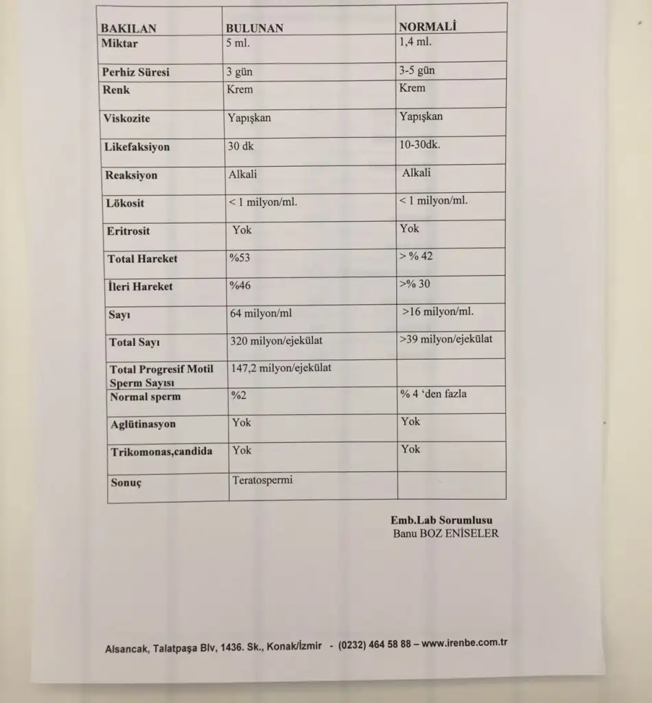 Ama benim içime sinmedi bikaç ay sonra irenbe ye gittik ürolojiye, dr devlet hastanesinin labına güvenmediğini söyledi bu sefer irenbe de test verdik. Toplam sperm 15 ml, morf % 1 çıktı. Tabi bu arada testesteron, fsh..falan hepsi normaldi.Noethvital diye bir ilaç verdi 6 ay kullanıp gebelik olmazsa gelin dedi. 6 ay sonra yine gittik test verdik ilacın etkisiyle sperm sayısı toplam 60 ml olmuş ama morf.yine %1 di. Dr doğal yolla beklerseniz zaman alır isterseniz tüp yapabilirsiniz dedi. Biz başka here danışmak için bu sefer egepole gittik. Hepsini analttık tüm sonuçları gösterdik.