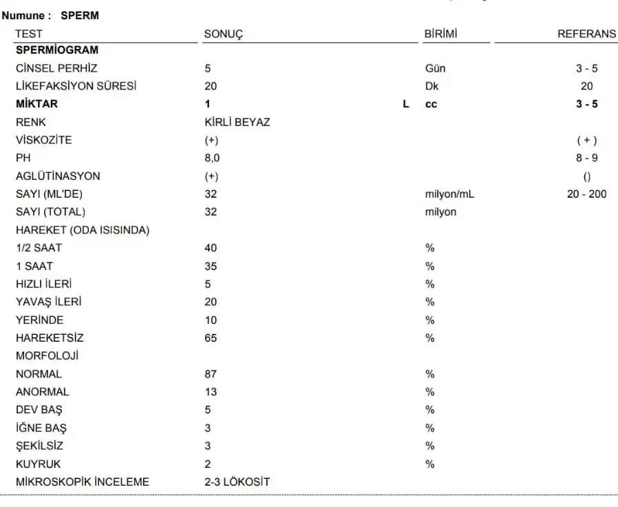 Merhaba arkadaşlar 1 yıldır evliyiz. Bebek istedik hiç korunmamamiza rağmen olmadı.. ovulasyon testi kullandım 2 ay yine olmadı.. ben doktora gittim hormon testleri ult. vs temiz cıktı doktor herşey çok normal dedi sonra eşim gitti. Varikosel cıktı eşimde tek taraflı 3 grade.. doktor ameliyattan başka çaren yok dedi eşim 28 yaşında. Spermiyogram sonuçlarını ekliyorum. Sayı normal fakat hareketlilik düşük dedi. Çocuğunuz olmaz ameliyat olmadan dedi. O kadar üzüldüm ki anlatamam eşimle eve geldik ağladık resmen.. tabi ki herşey Allahtan ama insan üzülüyor işte. Doktor da bi tuhaftı 3 bin tl ye ameliyatı yaparım dedi. Parasında değiliz ama insan bi vitamin takviyesi ne biliyim bi ilaç vermez mi öncesinde. Hatta ben sordum alternatif bi ürün vermicekmisiniz dedim hayır dedi tek çözüm ameliyat.. nolur yardımcı olun