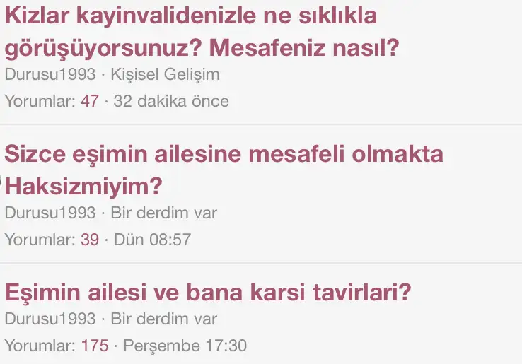 Eşimin annesine yakin oturuyoruz 6-7 dk mesafede ve ilk zamanlar her hafta gelmemiz icin cagiriyolardi. Resmen Sürekli baski altindaydim. Gittugimde surekli gel götur cay kahve bulasik isleri vs. Tmm kv yapar pisirir ama o kalabalikta ne yedigmi anliyorum ne bisey. Görumce ve kaynimdan hoslanmiyorum kesinlikle. Benimle ugrastilar nisanliyken kendilerine göre bisey yapmamislardir ama bir kac hareket ve sözde bulundular begenmedigim. Evlendim Yine ayni. Hep bi beni cekememezlik bi begenmemezlik. Dogru duryst umursamadilar kisacasi. Görumceyle fln konusmam öyle özel. Yazdan önce ufak tefek seyler oldu, yuz yuze tartisma cikmadi ama ben zaten hep mesafeli oldum oda zaten soguk davrandi. Ayni ortamda bir iki cumle ederiz o kadar.