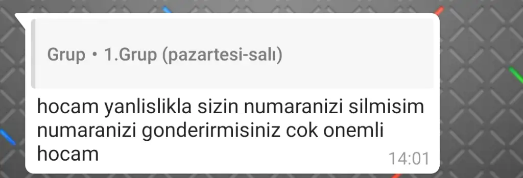 90larda whatsapp yoktu ogretmenlerin telefonlari ailemizde yoktu cok onemli bisey soyleyecek olurlarsa isten izin alip okula gelirlerdi senede iki defa da veli toplantisi yapilirdi. E biz okulu bitirdik demek ki whatsapptan ogretmene yazmadan da okul okunuyor. Hic anlamiyorum bugunku velileri...